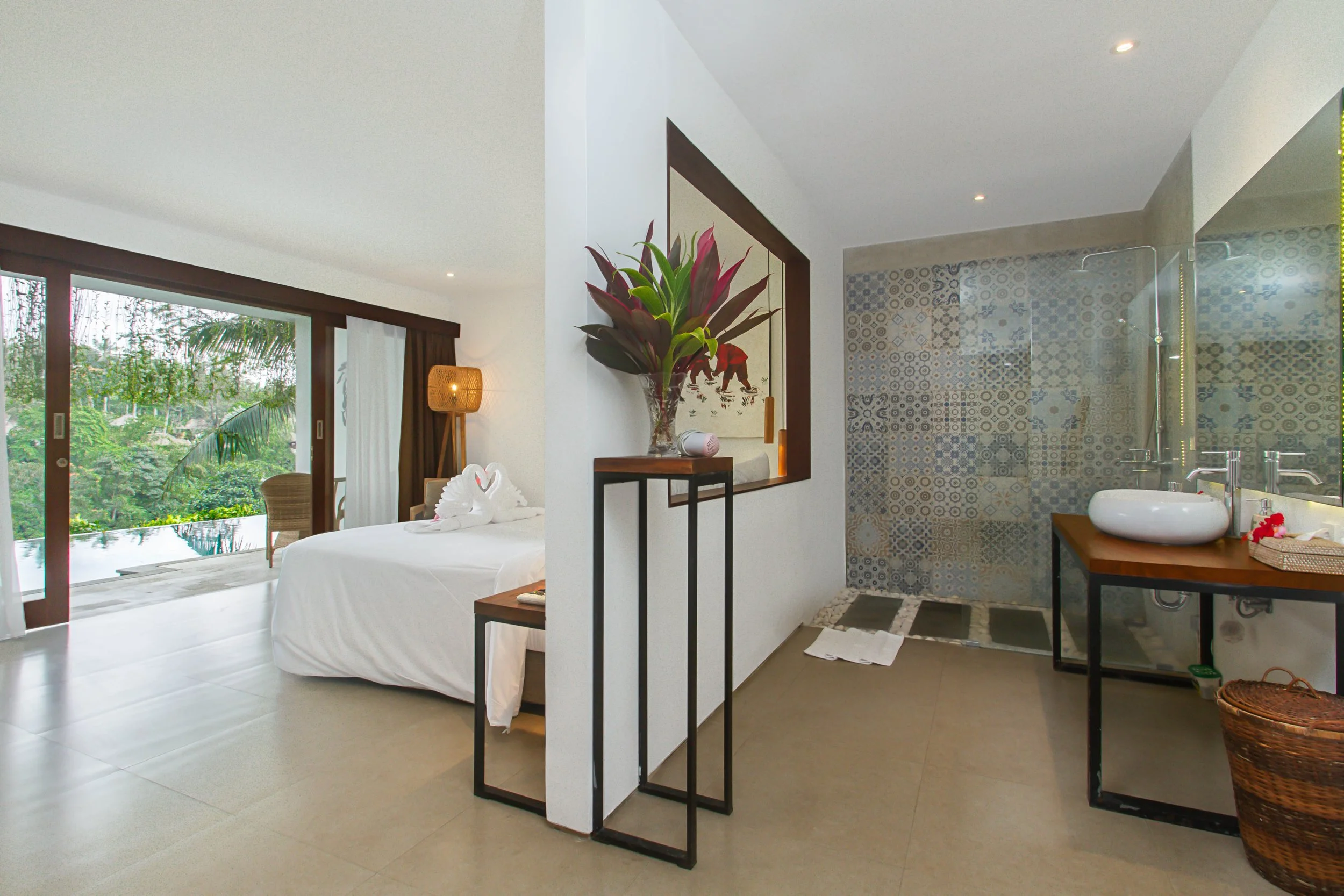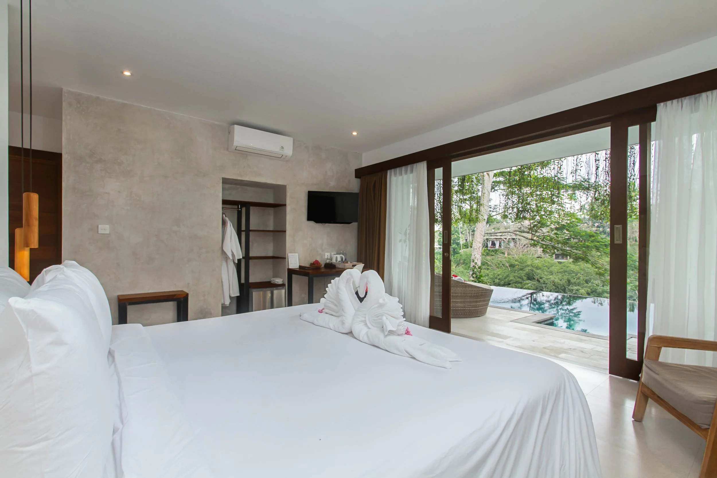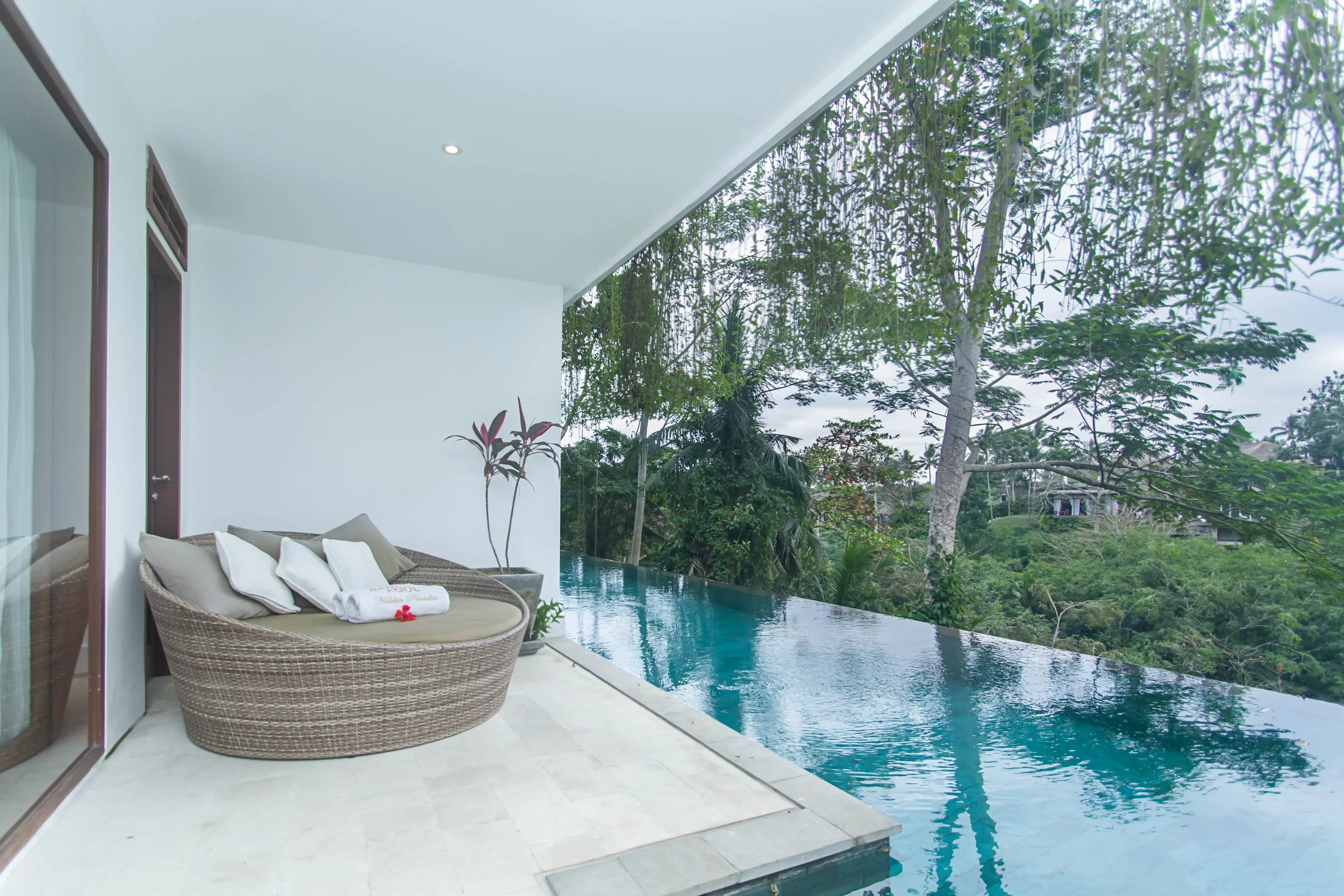 Our eight premier suites have a large and wide terrace, furnished with a living room and a dining table. This suites are all aligned along an incredible 50 meter long infinity pool that will give you the feeling of floating among trees and nature overlooking to the Petanu river valley